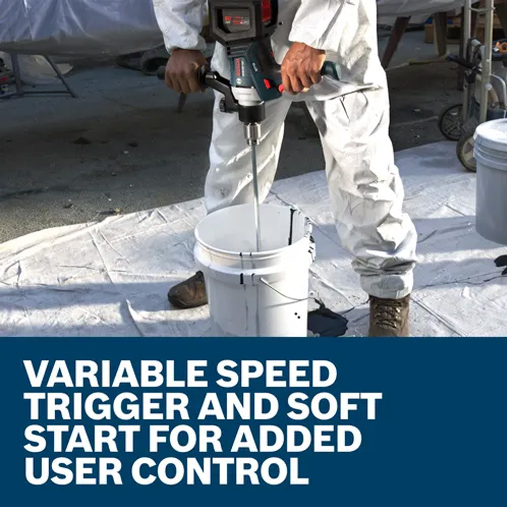 Its variable speed trigger and soft start technology enable both forward and reverse operation, giving the worker greater control to achieve a consistent mix and prevent splashing at startup.