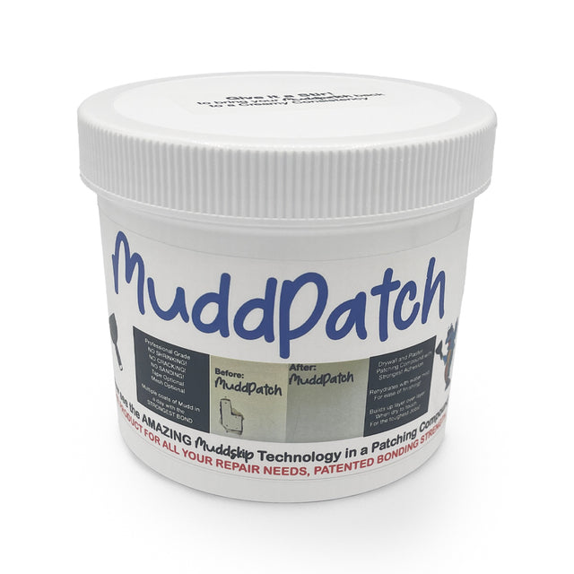 Strongest Adhesion – Finish Same Day. MuddPatch Patching Compound. It is great for those smaller jobs. Multiple coats in one day when dry to the touch. No Mesh! No Tape! No Sanding! No Shrinking! No Cracking! From the amazing technology labs of Muddskip, we are introducing the Strongest Adhesion and Finish Same Day patching compound you have ever seen. Available in 32 ounce container.