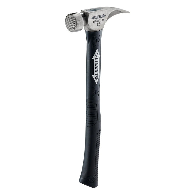 The STILETTO® 12oz Titanium Fiberglass Hammer with Milled Face and 16" Curved Handle is more durable and has more prying strength than hickory handled hammers. This 12oz titanium hammer hits like a 21oz steel hammer with 45% less weight. It is recommended for finish carpentry, remodeling, and light framing. The Titanium Fiberglass Hammer includes a magnetic nail starter and durable fiberglass handle with an ergonomic thumb divot