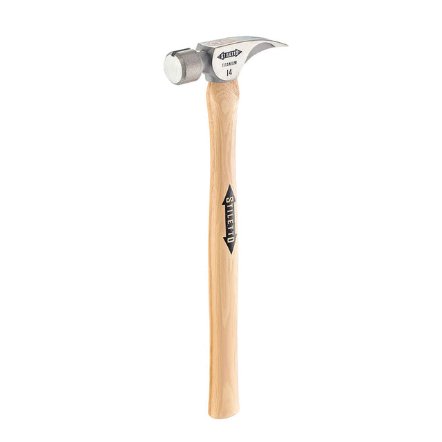 The STILETTO® 14oz Titanium Hickory Hammer with Smooth Face and 18" Straight Handle is made with shock-absorbing USA Hickory. This 14oz titanium hammer hits like a 24oz steel hammer with 45% less weight. It is recommended for rough framing and remodeling. The Titanium Hickory Hammer includes a magnetic nail starter and replaceable handle.